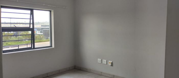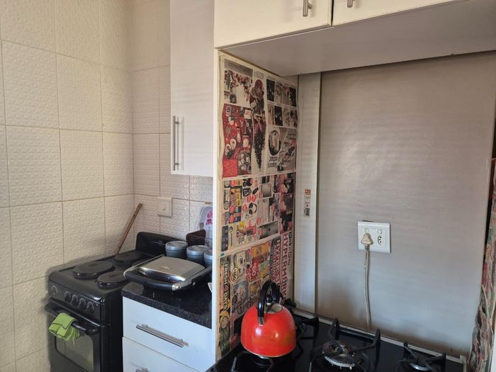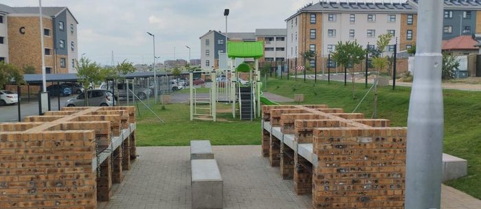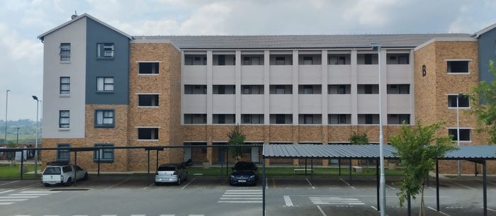 Riverside living with secure community amenities in Riverside View — sunlit open-plan apartment featuring granite kitchen with 4-plate stove, communal braai, two bedrooms, covered carport.