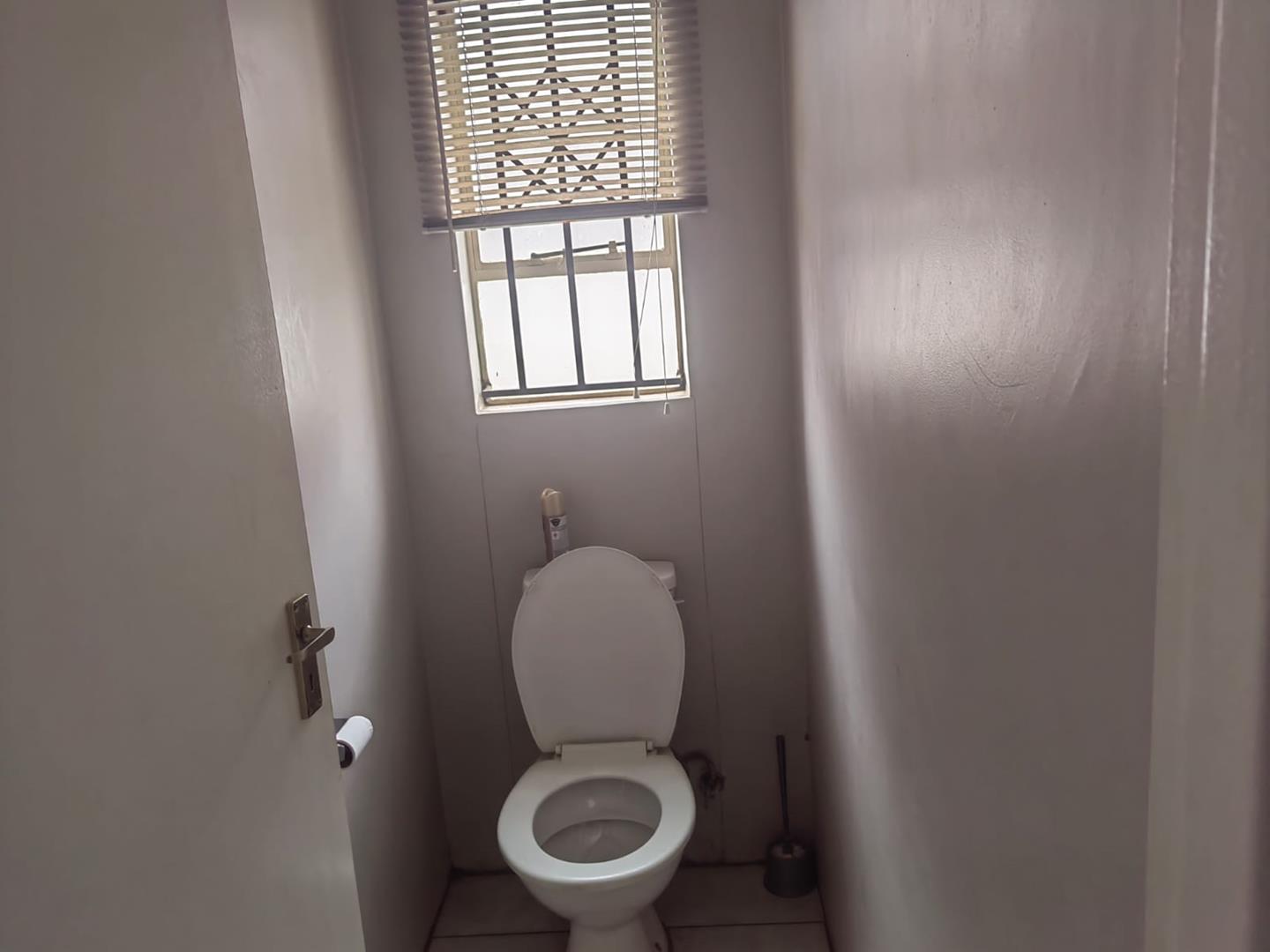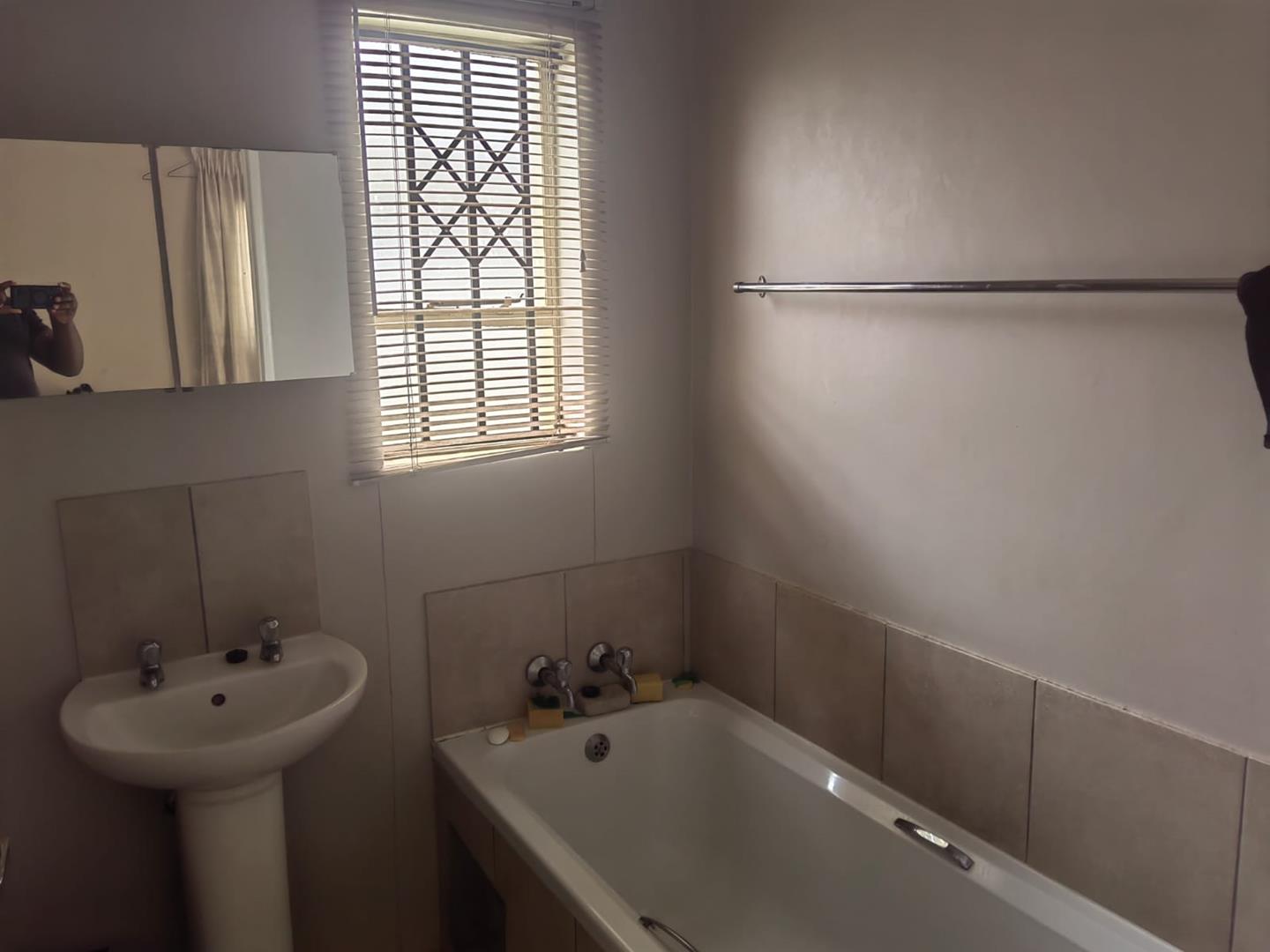 Separate bathroom with floor tiles with a bath and basin. Separate toilet. Burglar bars throughout.