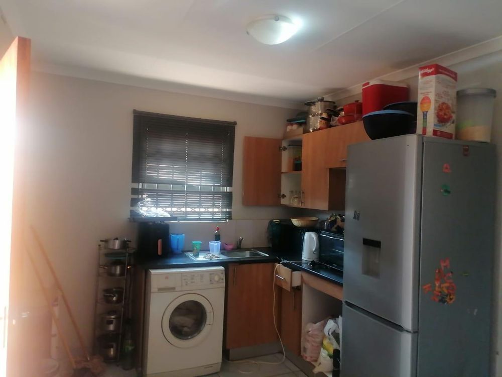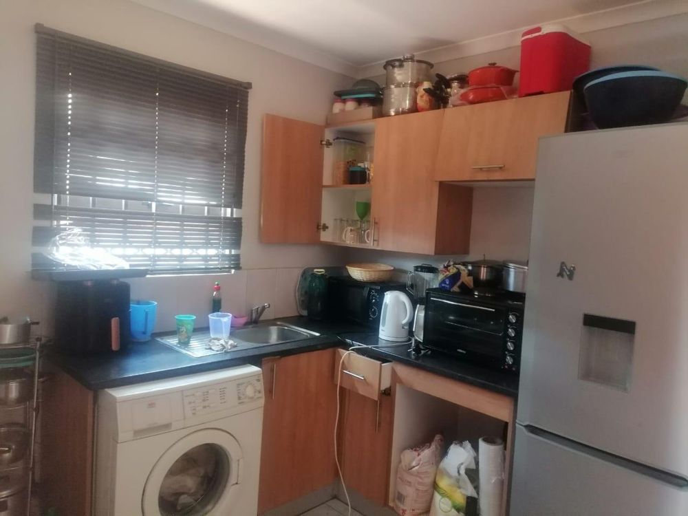 Separate tiled bathroom with a bath , basin and toilet . Tiled lounge. Kitchen with oak colour finish built in cupboards ( no stove )