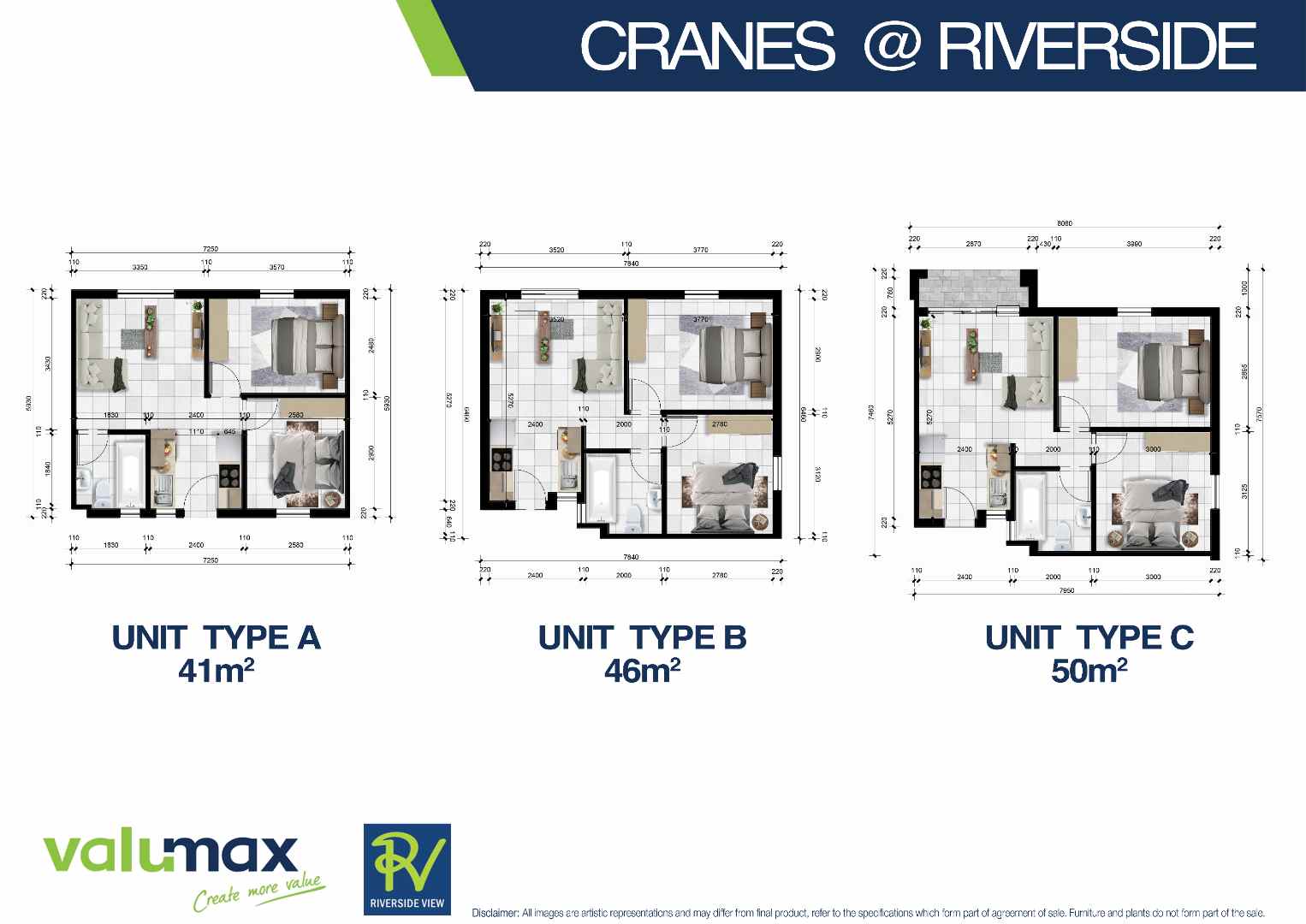 Brand New 2 bed apartments in Riverside View . From 41-50 m2 . Excellent value offering 2 tiled bedrooms with build in cupboards. Separate tiled bathroom with a bath , basin , toilet and splash tiles .