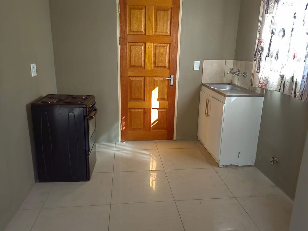 Open plan tiled living area onto a tiled kitchen with a 4 plate free standing defy stove/ oven combination.