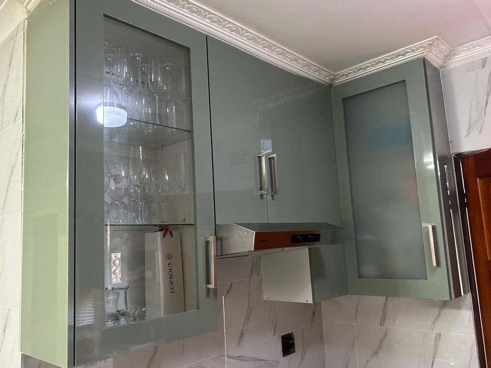 Open plan living area onto a lovely modern kitchen with built in cupboards , gas stove and defy undercounter oven and extractor fan .