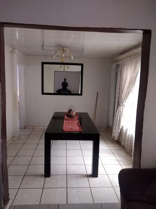 4-bedroom house in Vosloorus with built-in cupboards, en suite bathroom, family room, dining room, fitted kitchen, garage, carport, burglar bars, and security gates.