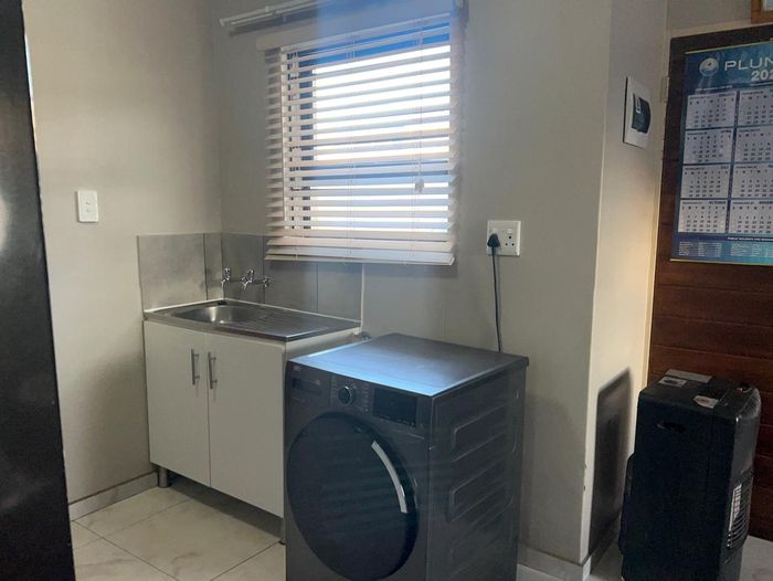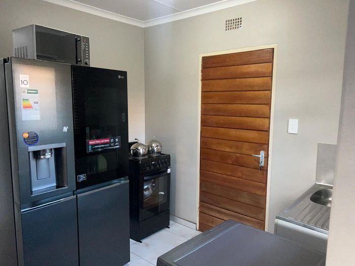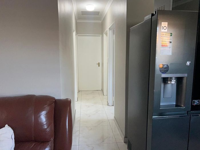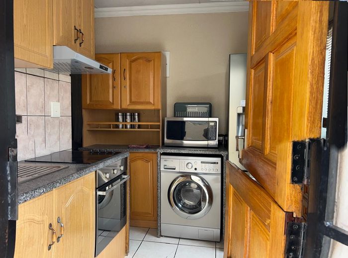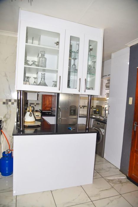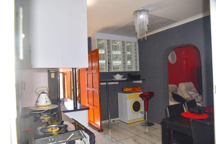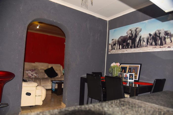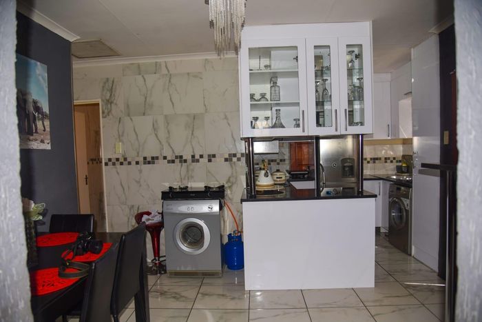 Secure Clayville home with gated boundary and paved yard, relaxed open-plan living flowing to tiled kitchen with built-in cupboards and counter stove. Double carports, three bedrooms, one bathroom.