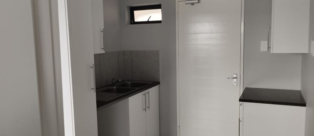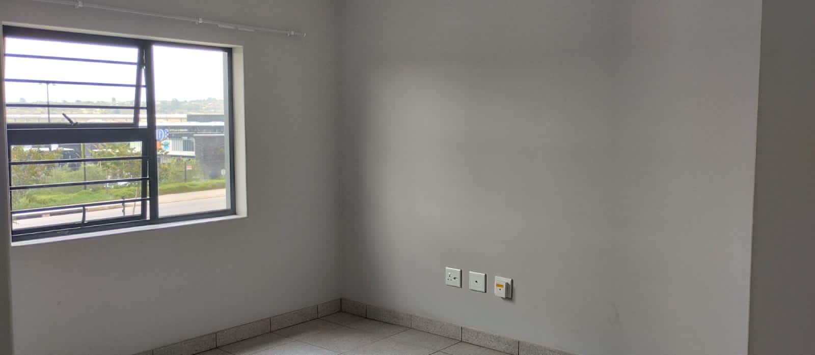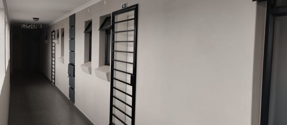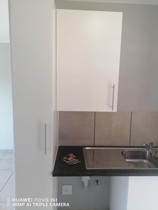 Open plan tiled living area onto a tiled kitchen with built in white melamine cupboard and granite tops. Free standing Defy 4 plate stove / oven combination.Secure complex with access control.
