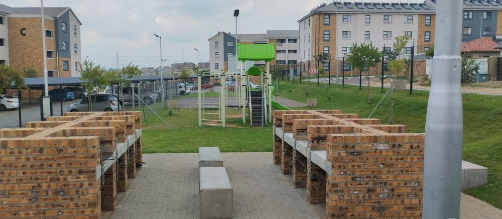 Single carport. There is a communal braai area , play area for children and a combi court for all types of ball sports.