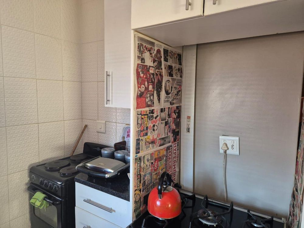 Open plan tiled living area onto a tiled kitchen with a 4 plate stove , built in cupboards and a sink cabinet.