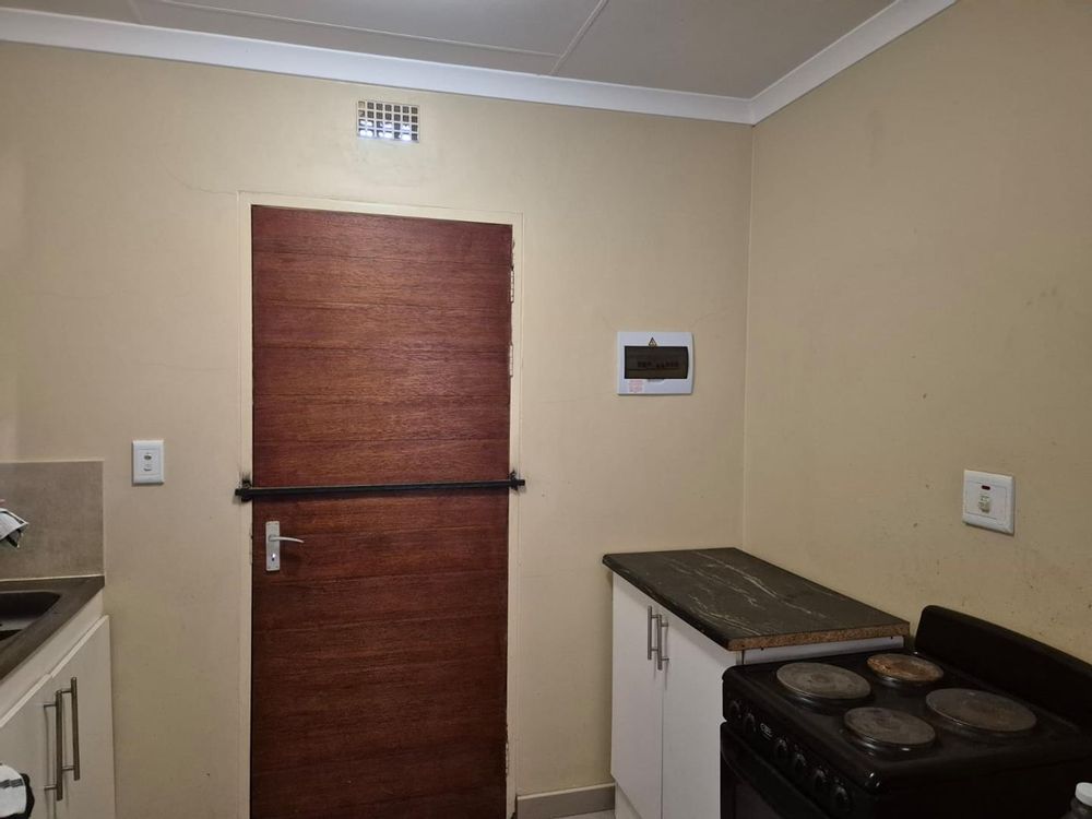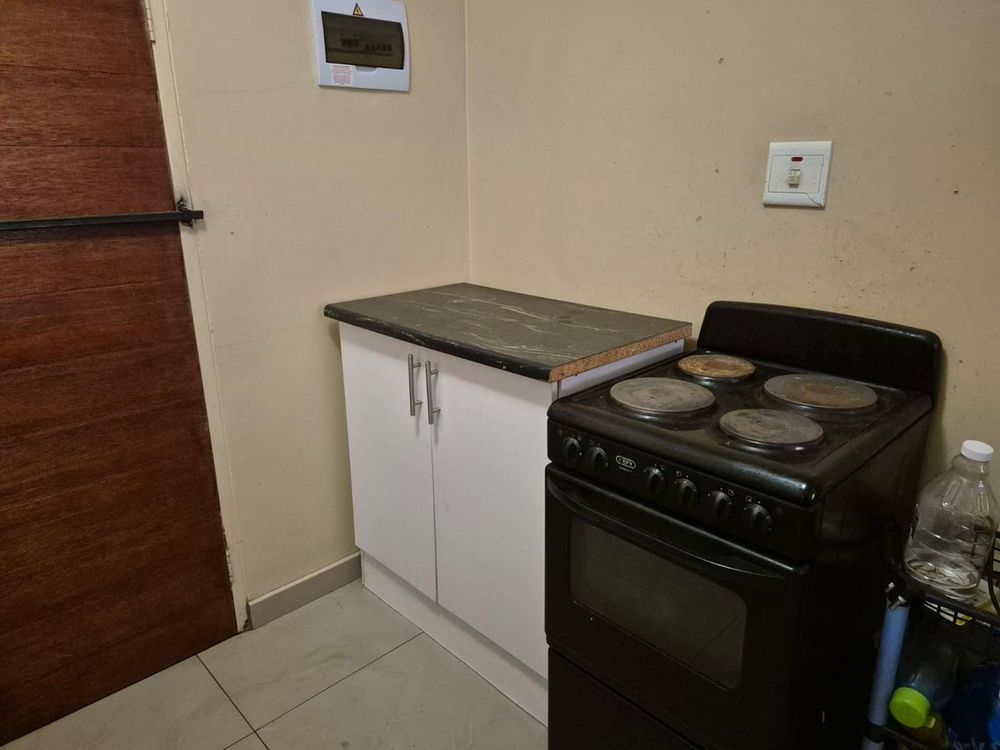 Separate bathroom with a bath , basin and toilet. Tiled living area onto a tiled kitchen with a 4 plate stove and sink cabinet.