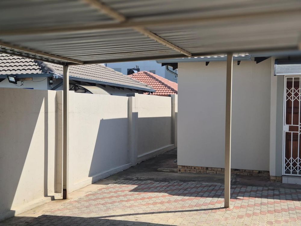 Property has security gates and burglar bars . There is a garden in the front . Single paved carport. Property is walled and gated